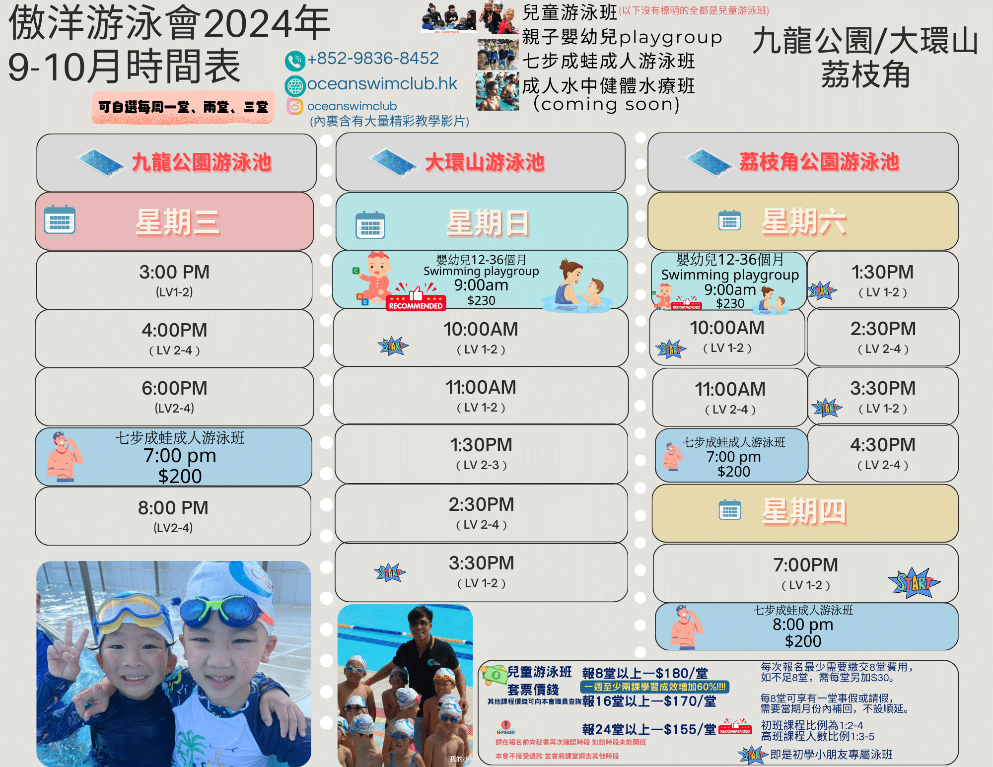 • 依年齡及程度分班: 無論是初學游泳的孩子,或是已有基礎希望找到精進游泳技能的練習,皆適合的課程。