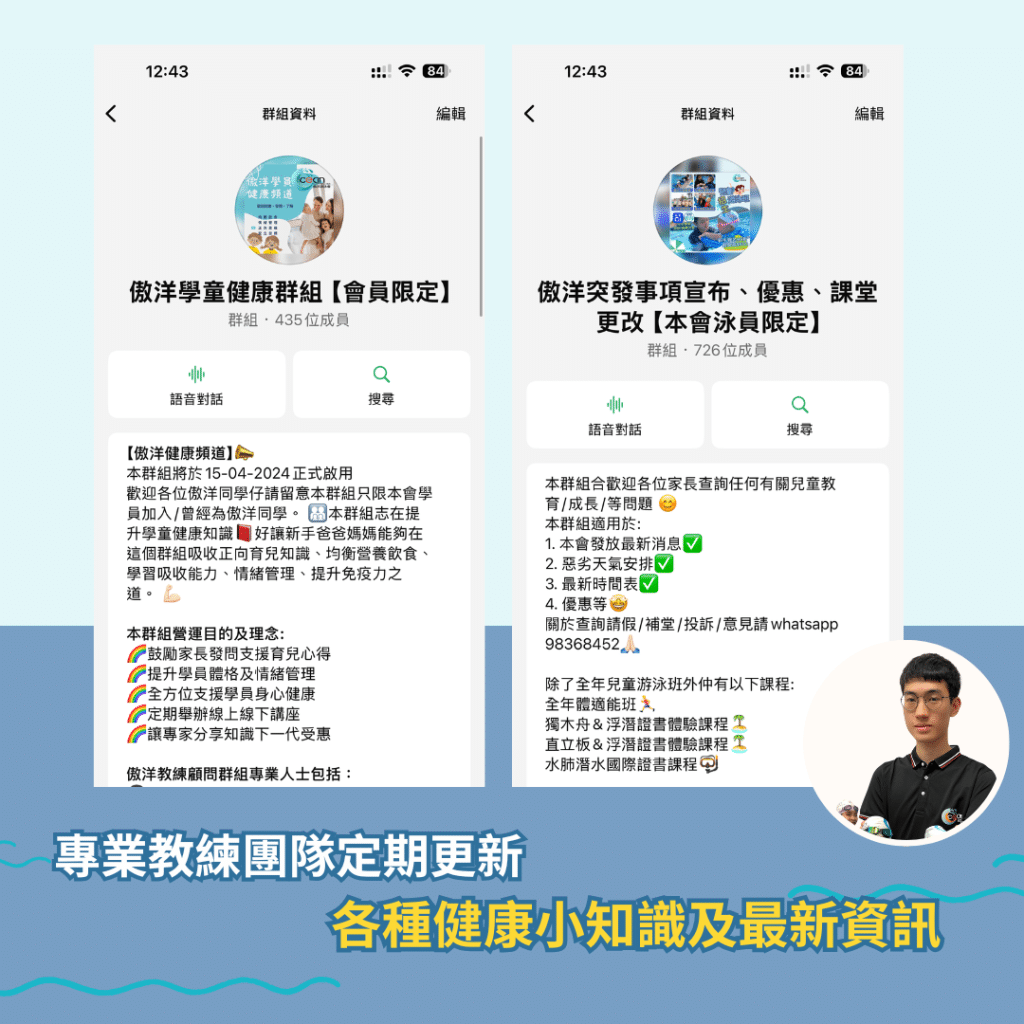 為了方便家長第一時間掌握最新資訊,傲洋游泳會設有專屬 WhatsApp 家長群組,由行政團隊定期更新課堂安排,包括:
